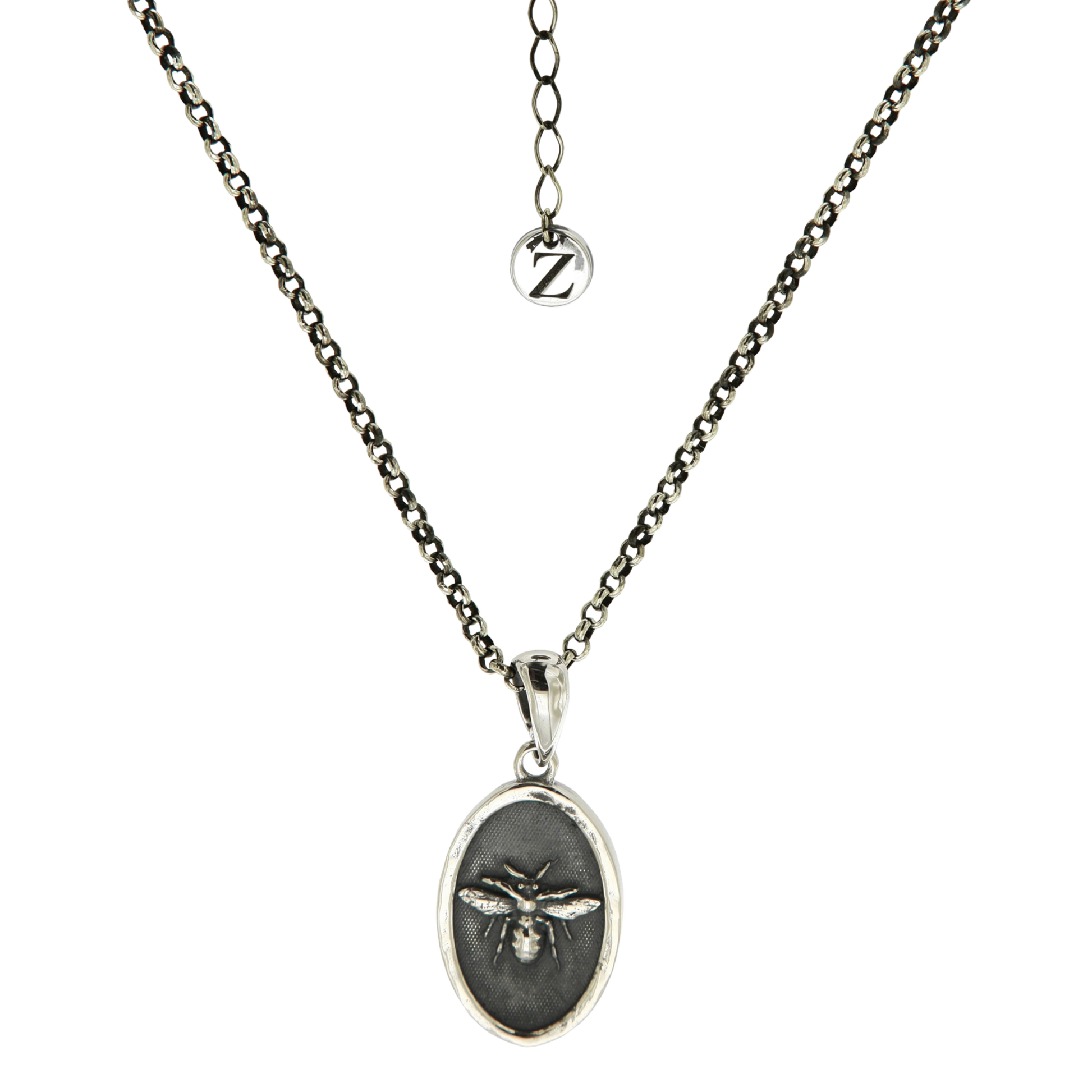 Collar de cadena de perlas con un dije ovalado grabado con una abeja. Cadena: 55 cm + 5 cm extensible. Dije: 2.5 cm x 1.7 cm.