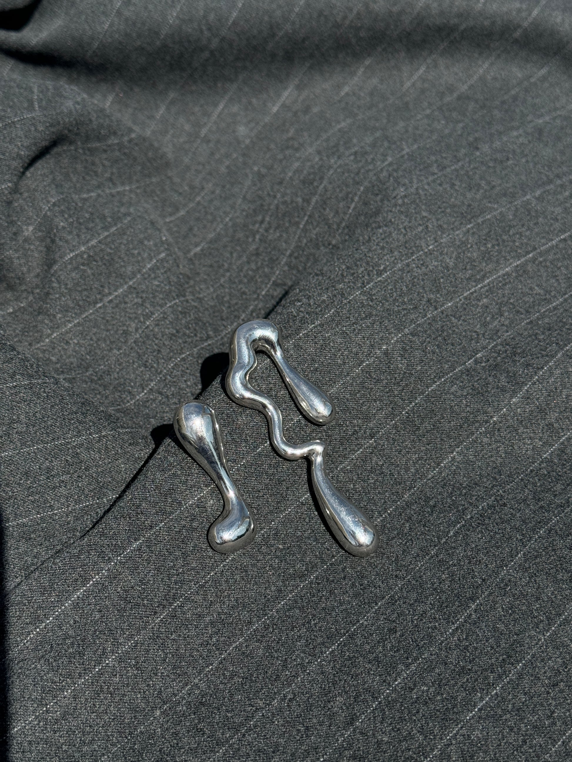 Mismatched earrings inspired by organic shapes, resembling melting metal.