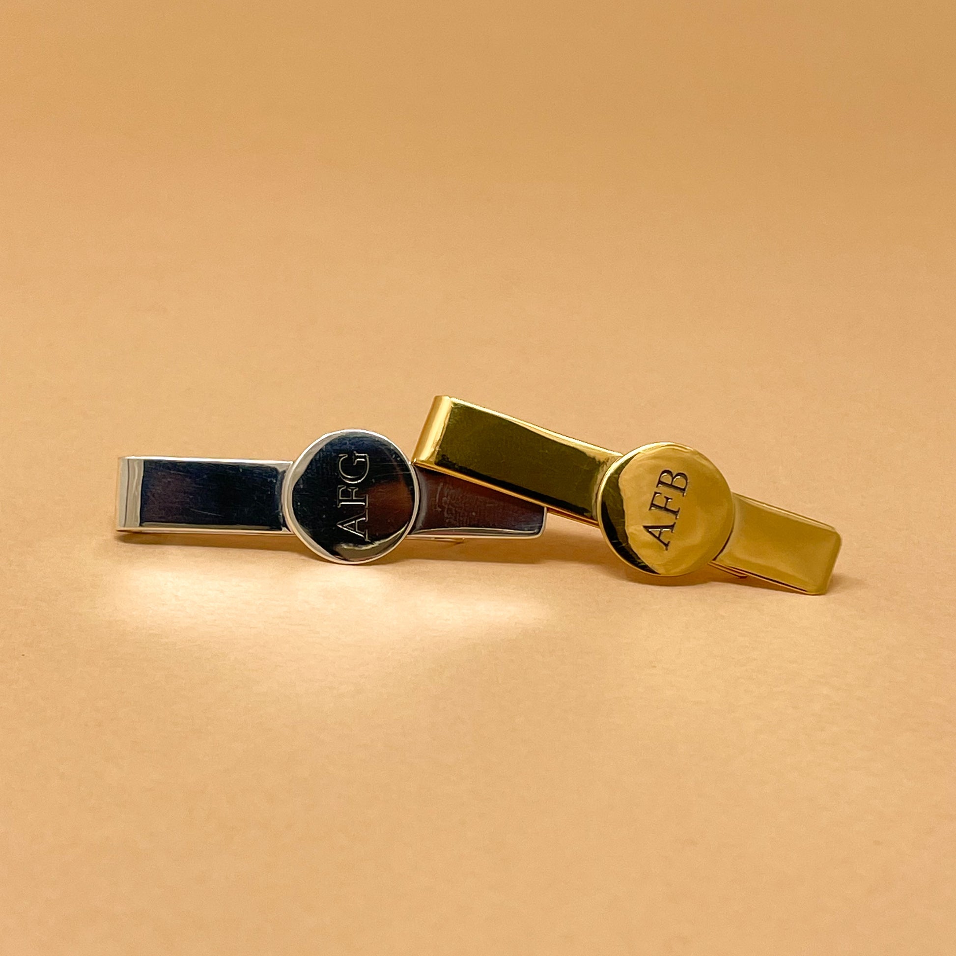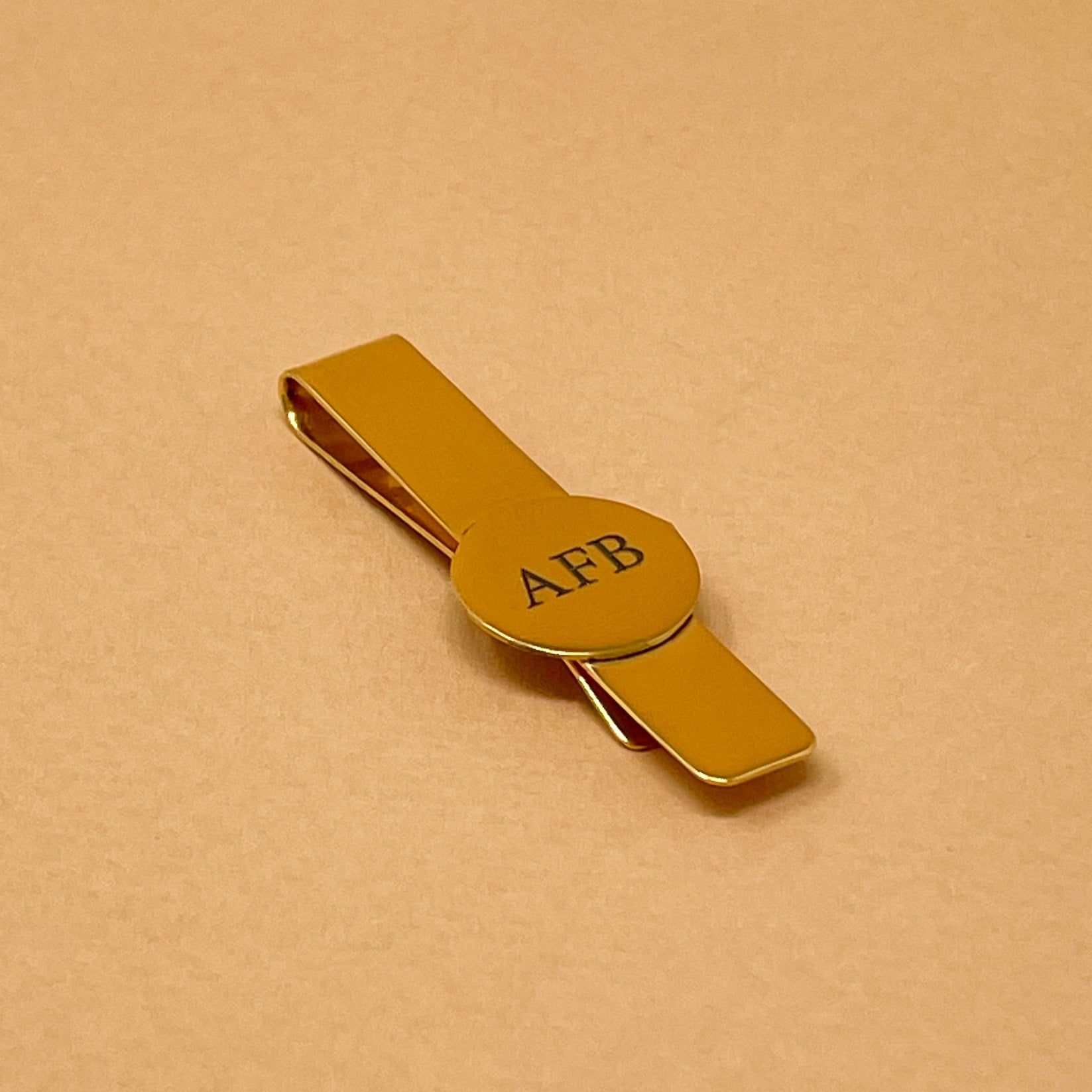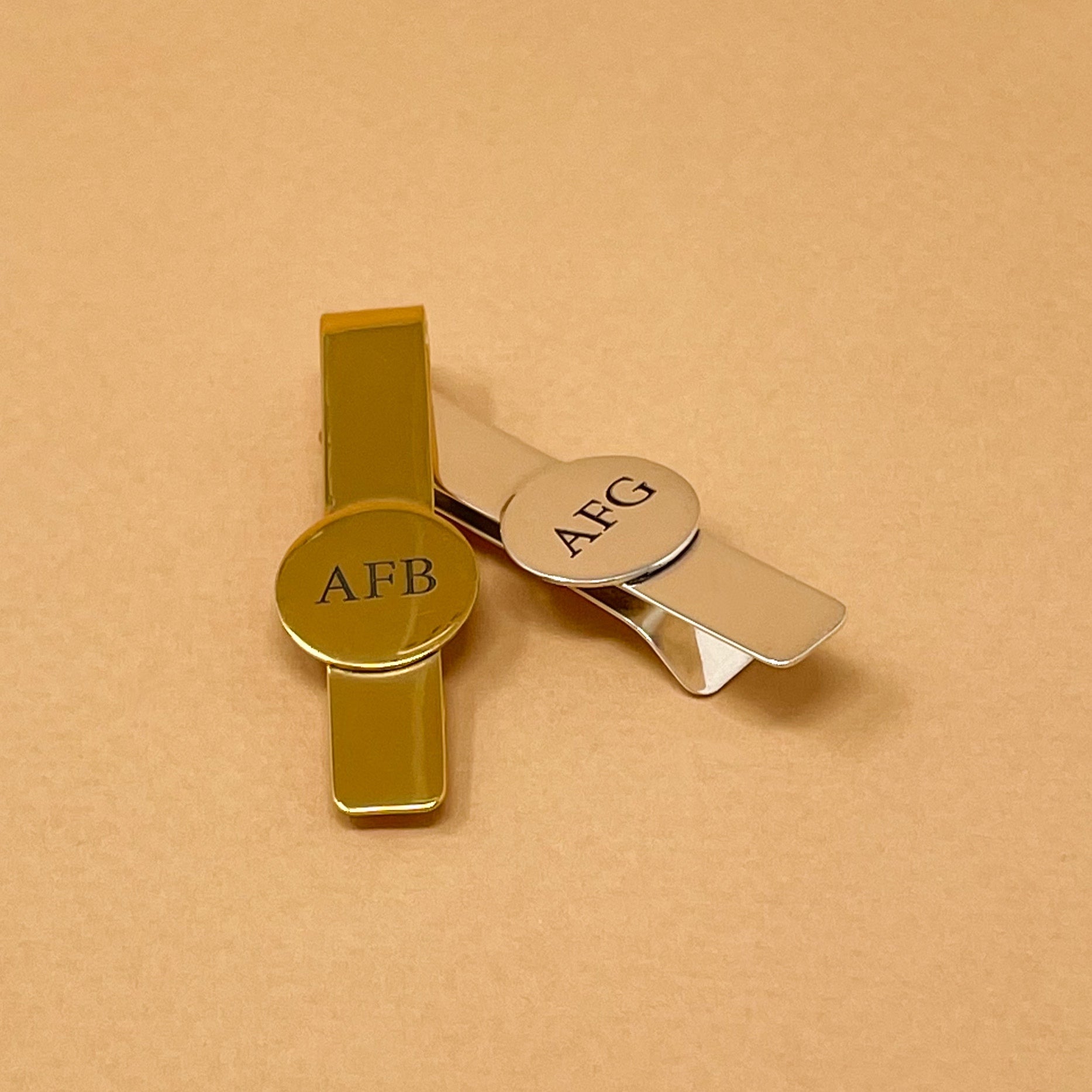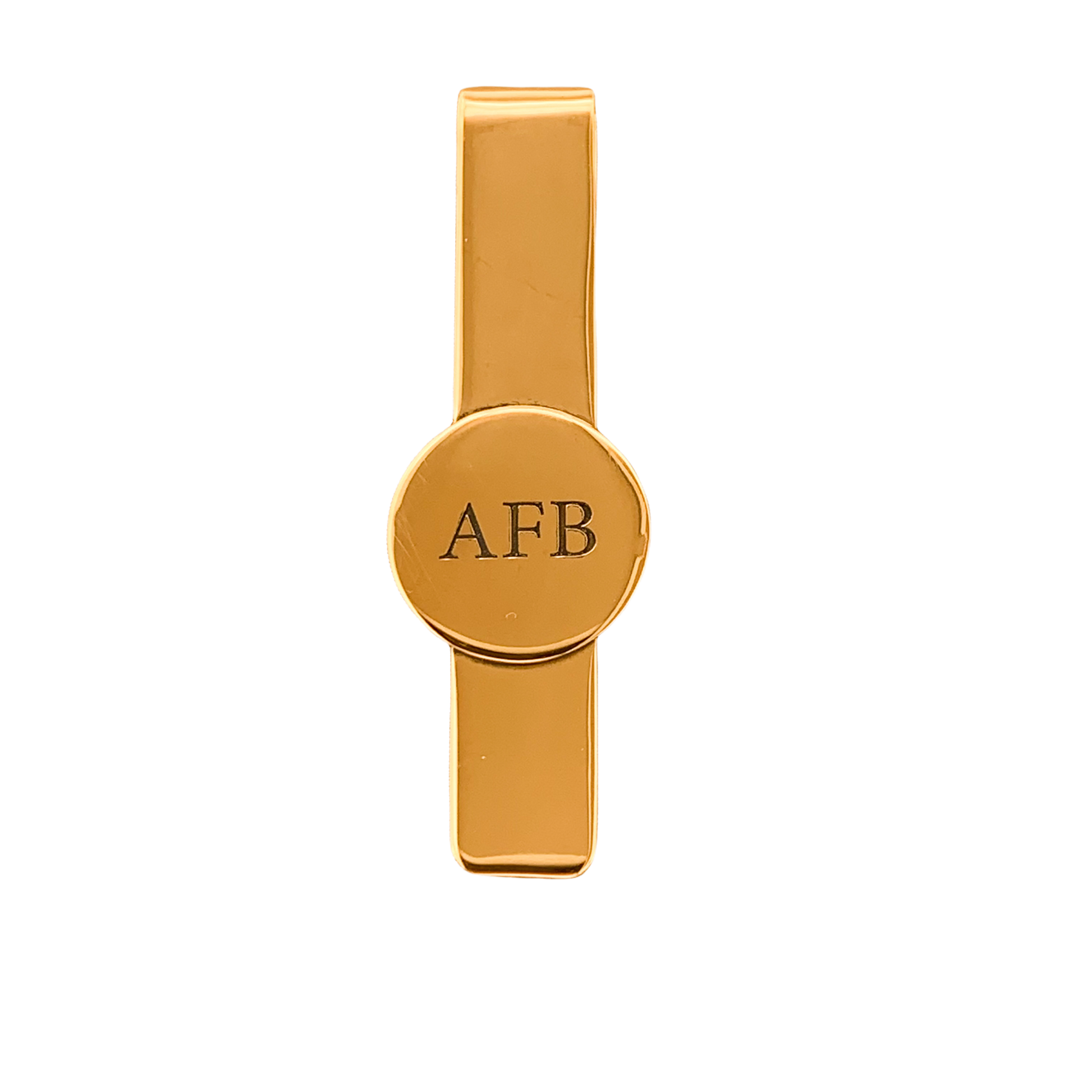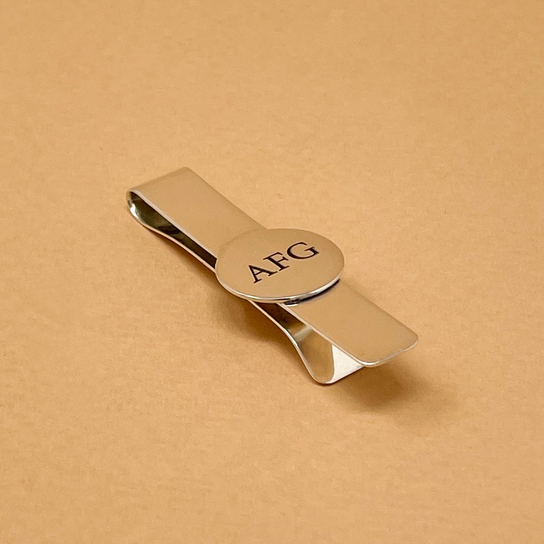 A classic, sleek money clip featuring a circular motif with an option to personalize it with your initials. Size: 4 cm x 0.5 cm.