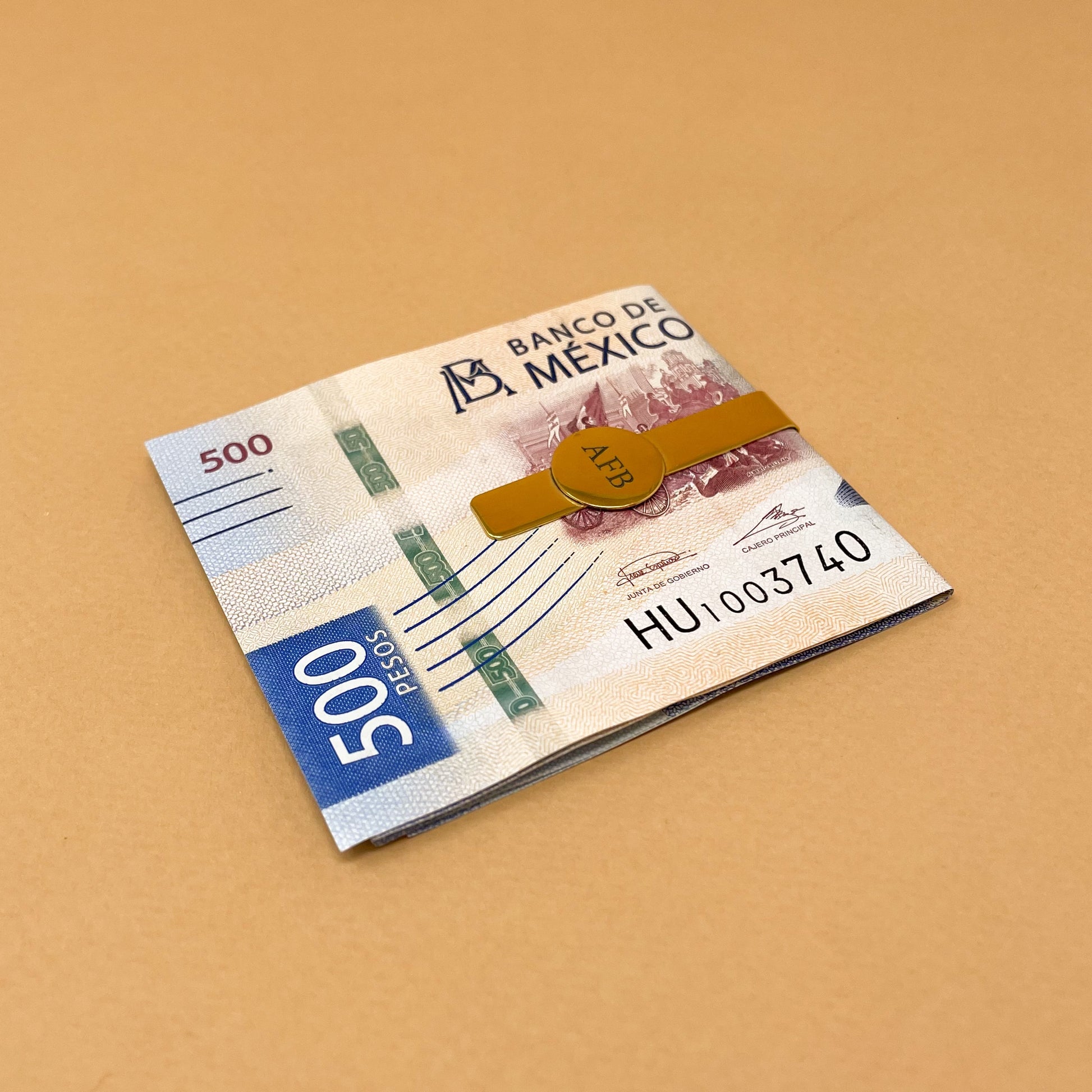 Un clip para billetes elegante y clásico con motivo circular, personalizable con tus iniciales. Tamaño: 4 cm x 0.5 cm.
