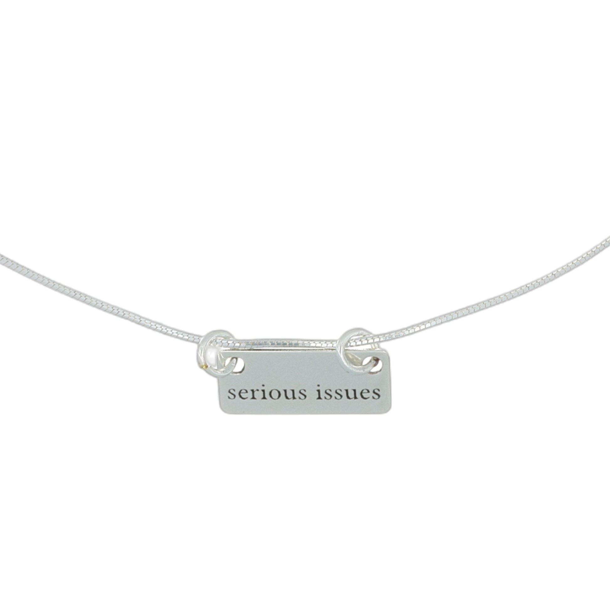 Thin chain with a rectangular charm engraved with "Serious Issues".