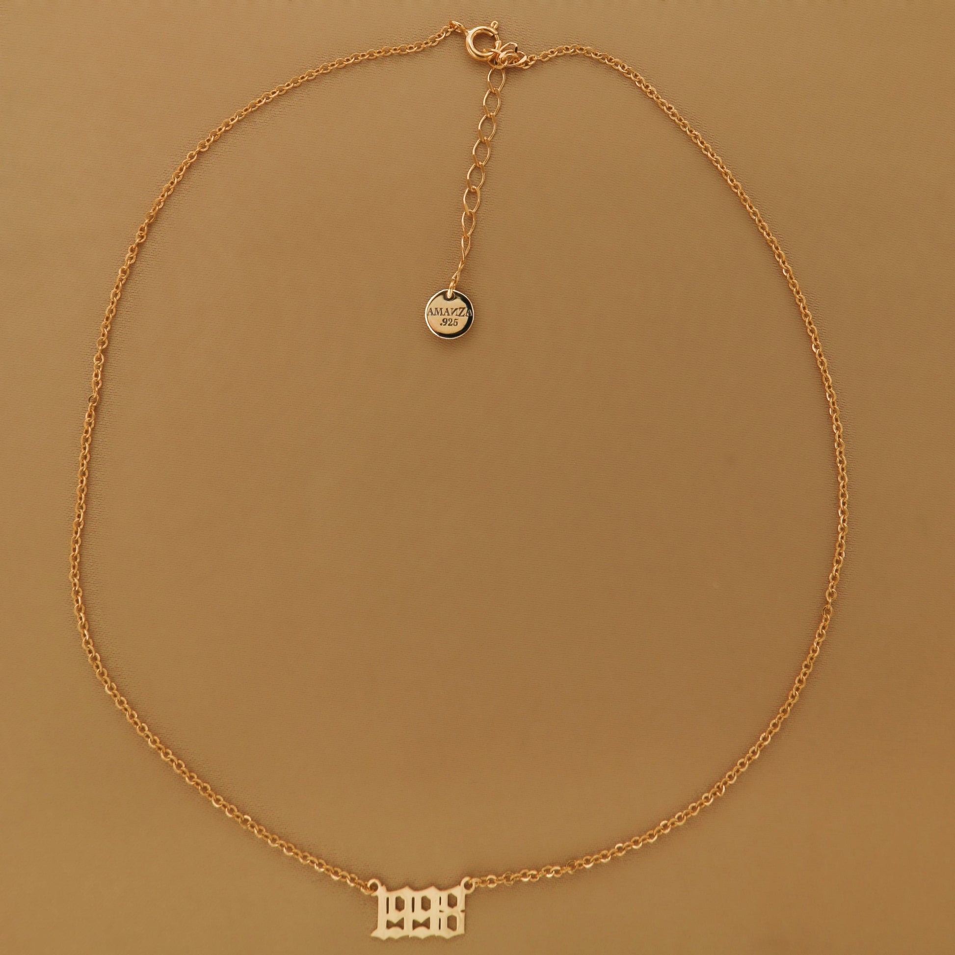 Cadena delicada con un dije personalizable con tu año de nacimiento en fuente gótica. Cadena: 40 cm + 5 cm extensible Dije: 0.6 cm x 1 cm.